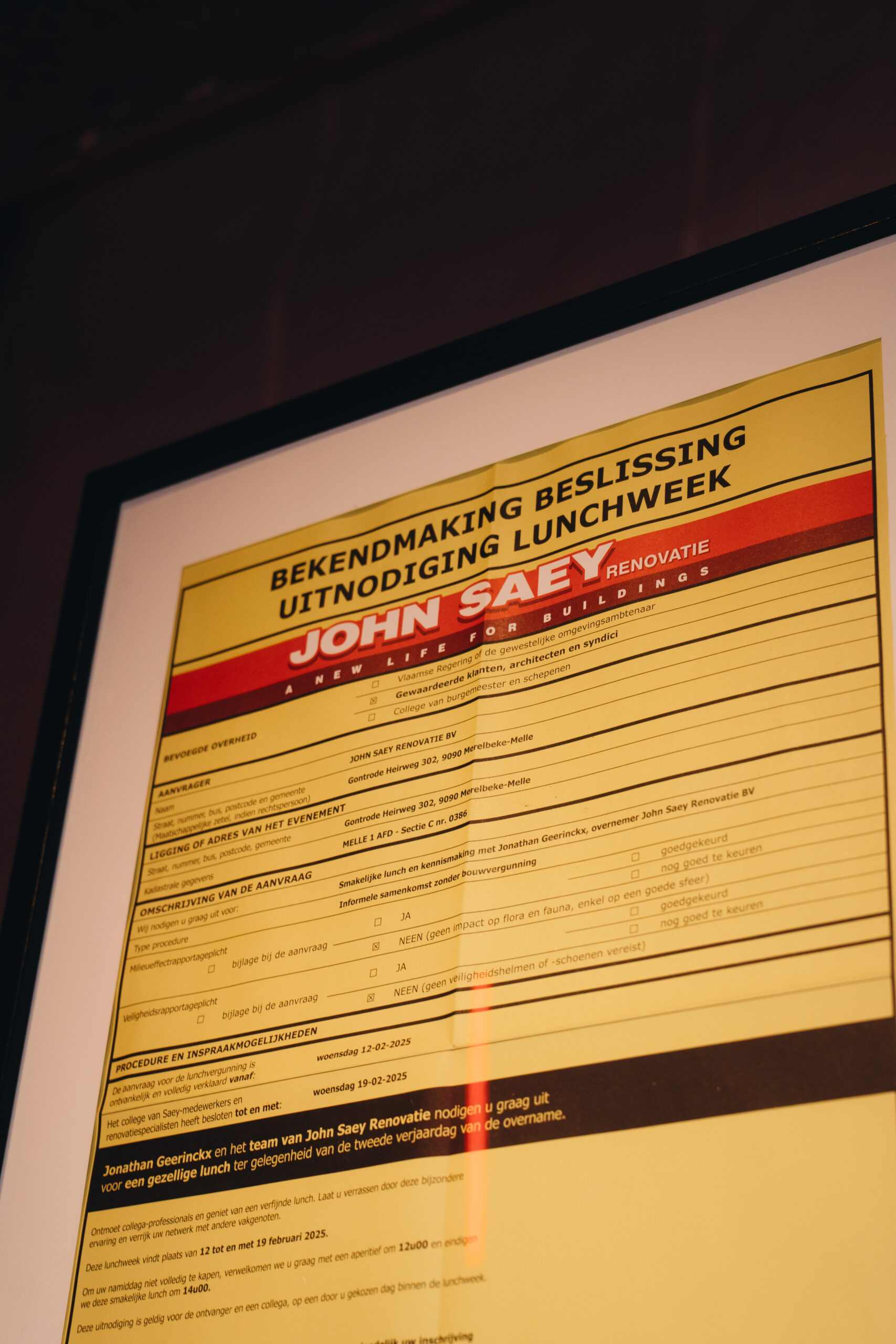 Conceptualisation, execution, and organisation of the Loyalty Lunches for John Saey — inspired by the raw beauty of the (construction) site itself. The iconic John Saey-red set the tone, and like every good story, it started with an invitation — this time disguised as a building permit. Guests entered through the warehouse and followed a lit-up path straight to the apero zone, fully wrapped in scaffolding to evoke the raw atmosphere of an active construction site. Bites were served on bricks, staying true to the concept down to the smallest detail. Afterwards, the curtains opened to unveil the dinner space and welcome guests to the table — a striking shift from raw structure to refined setting.